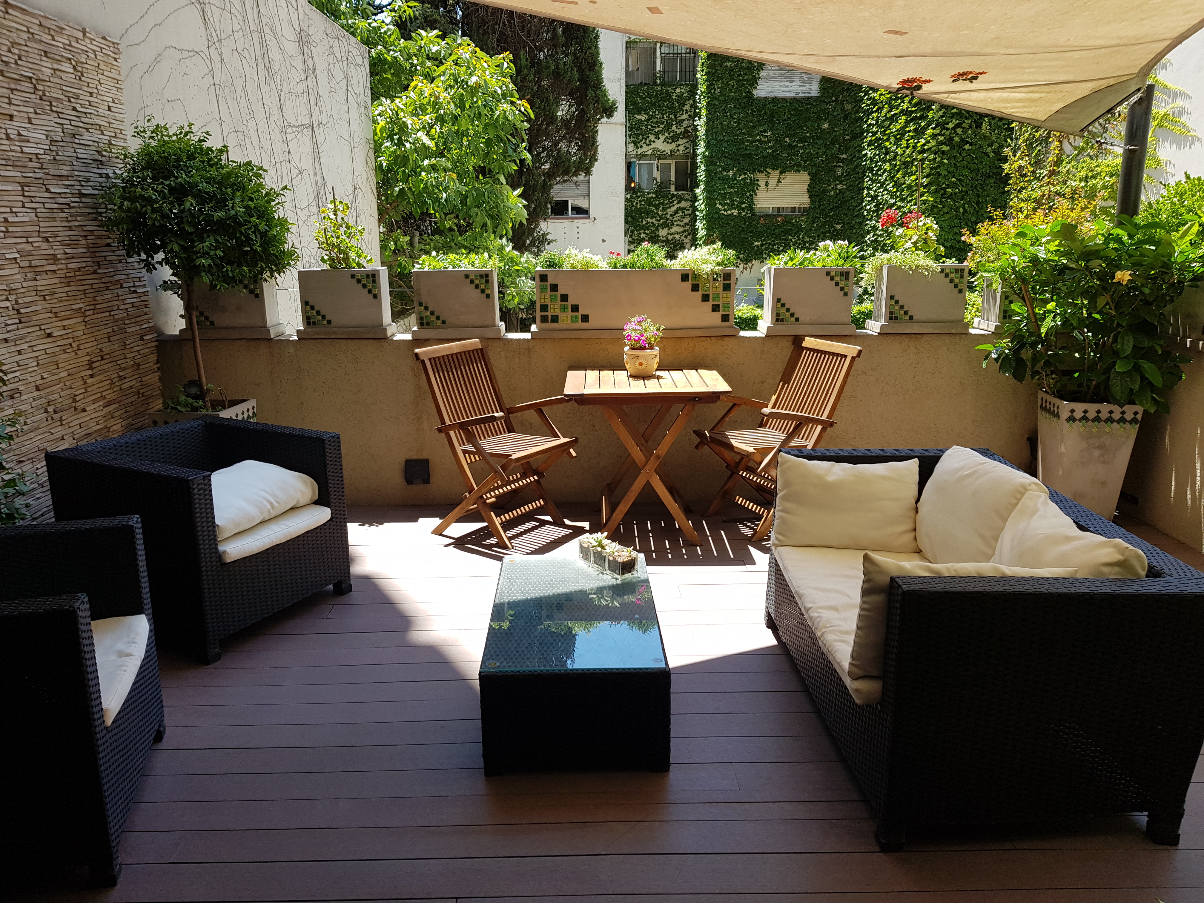 Pisos de porcelanatto en ambiente y baño y de madera en balcón terraza y patio.