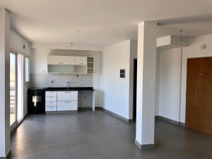 Primera planta: Living comedor con cocina incorporada, balcón corrido al frente y toilete de recepción.
