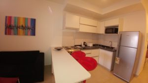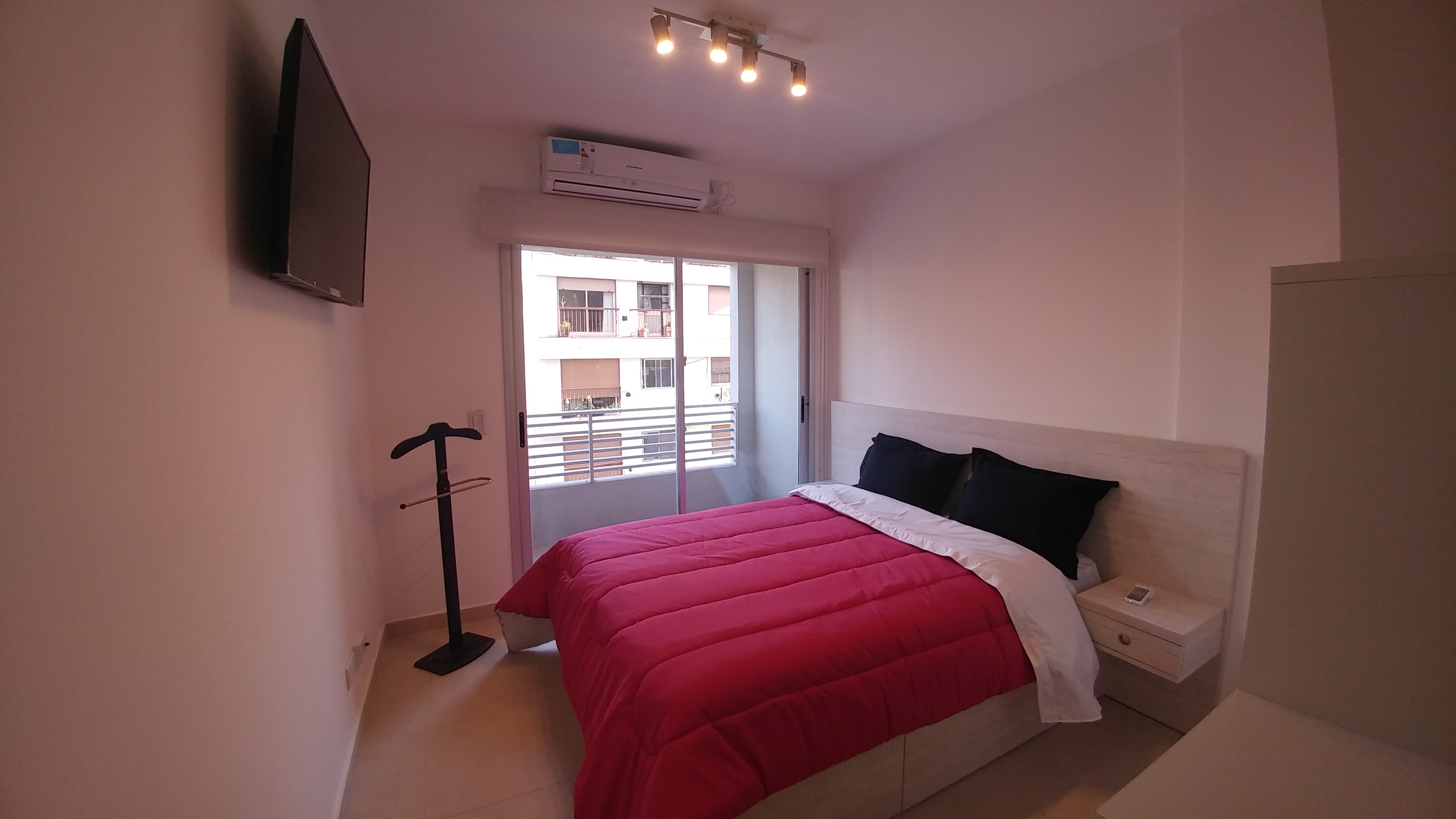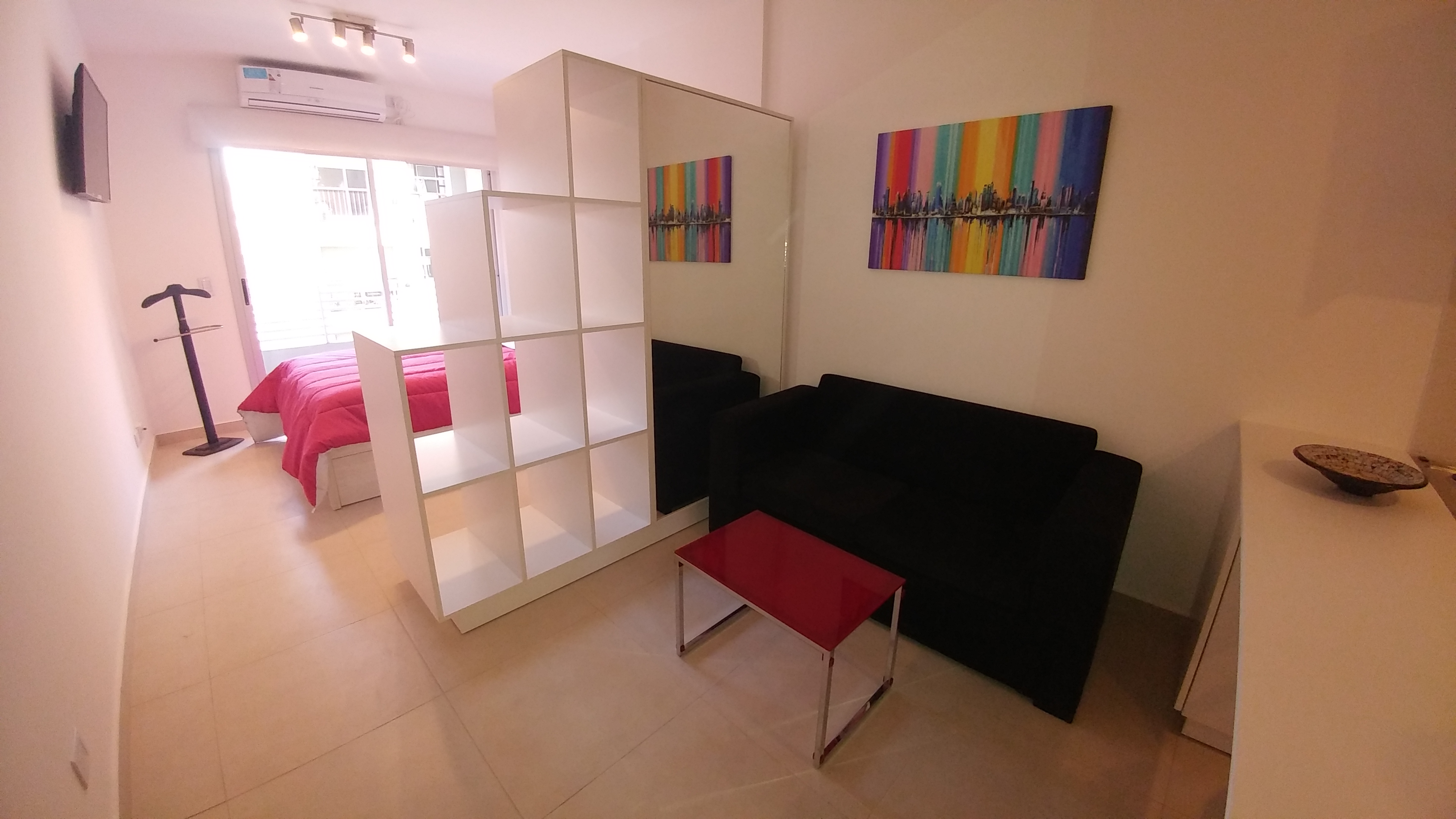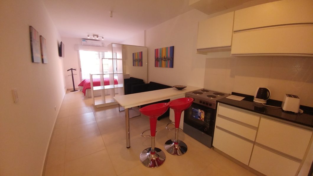 Impecable departamento con cocina integrada totalmente equipada, cama matrimonial con espacio de guardado y zapatero y baño completo con bañera.