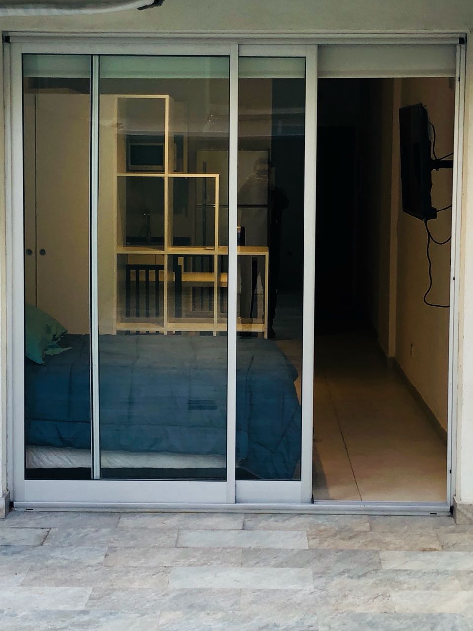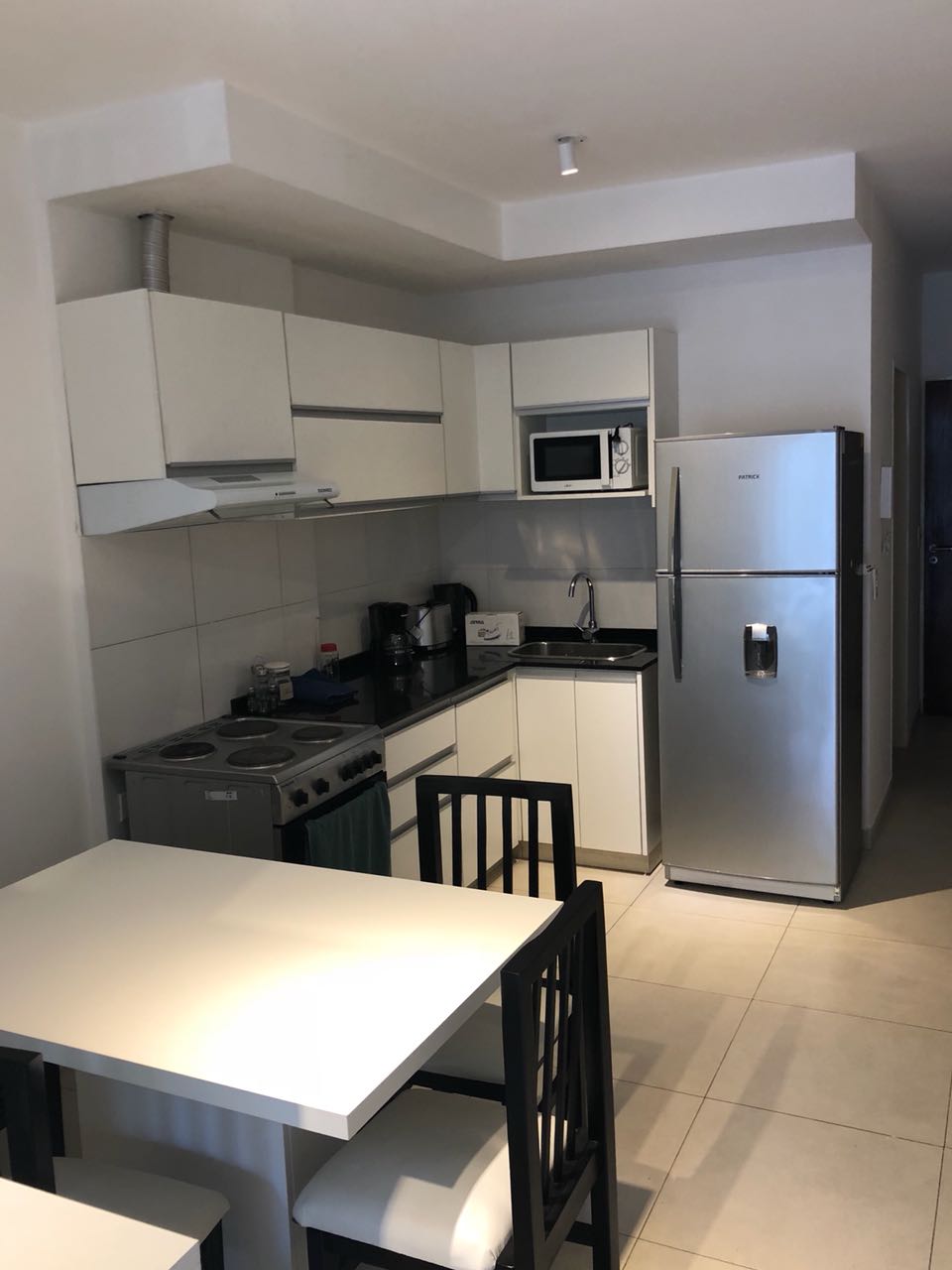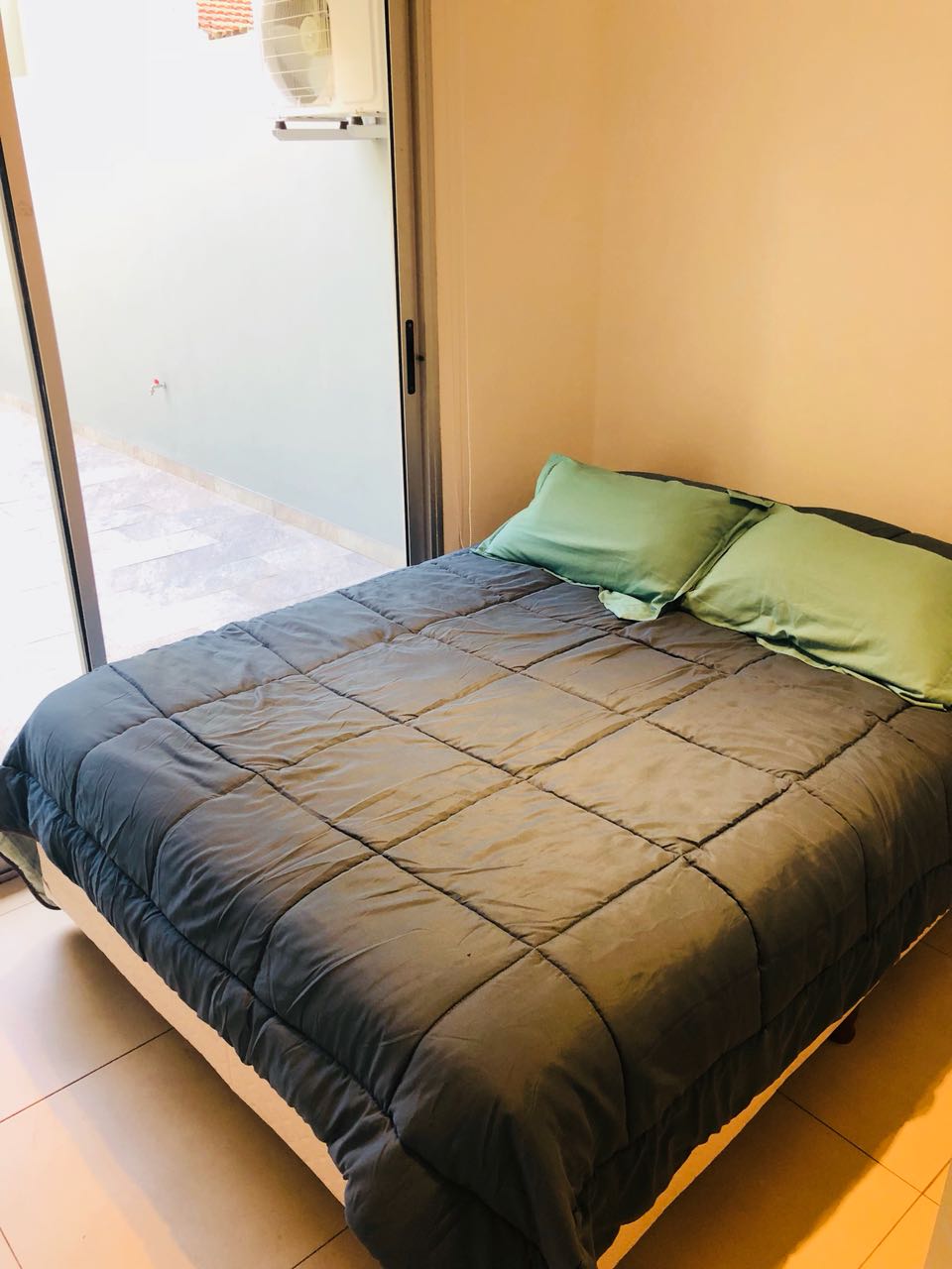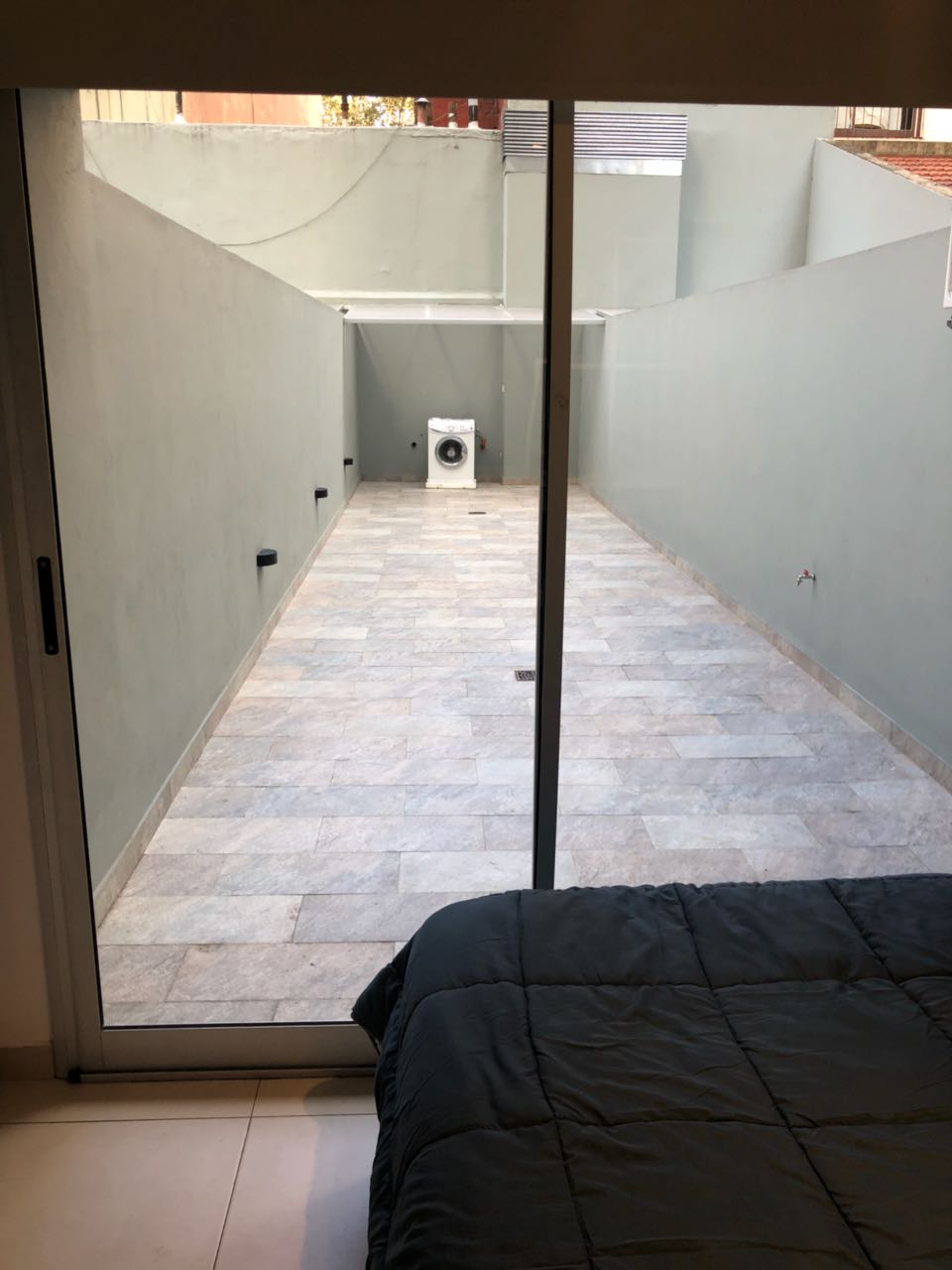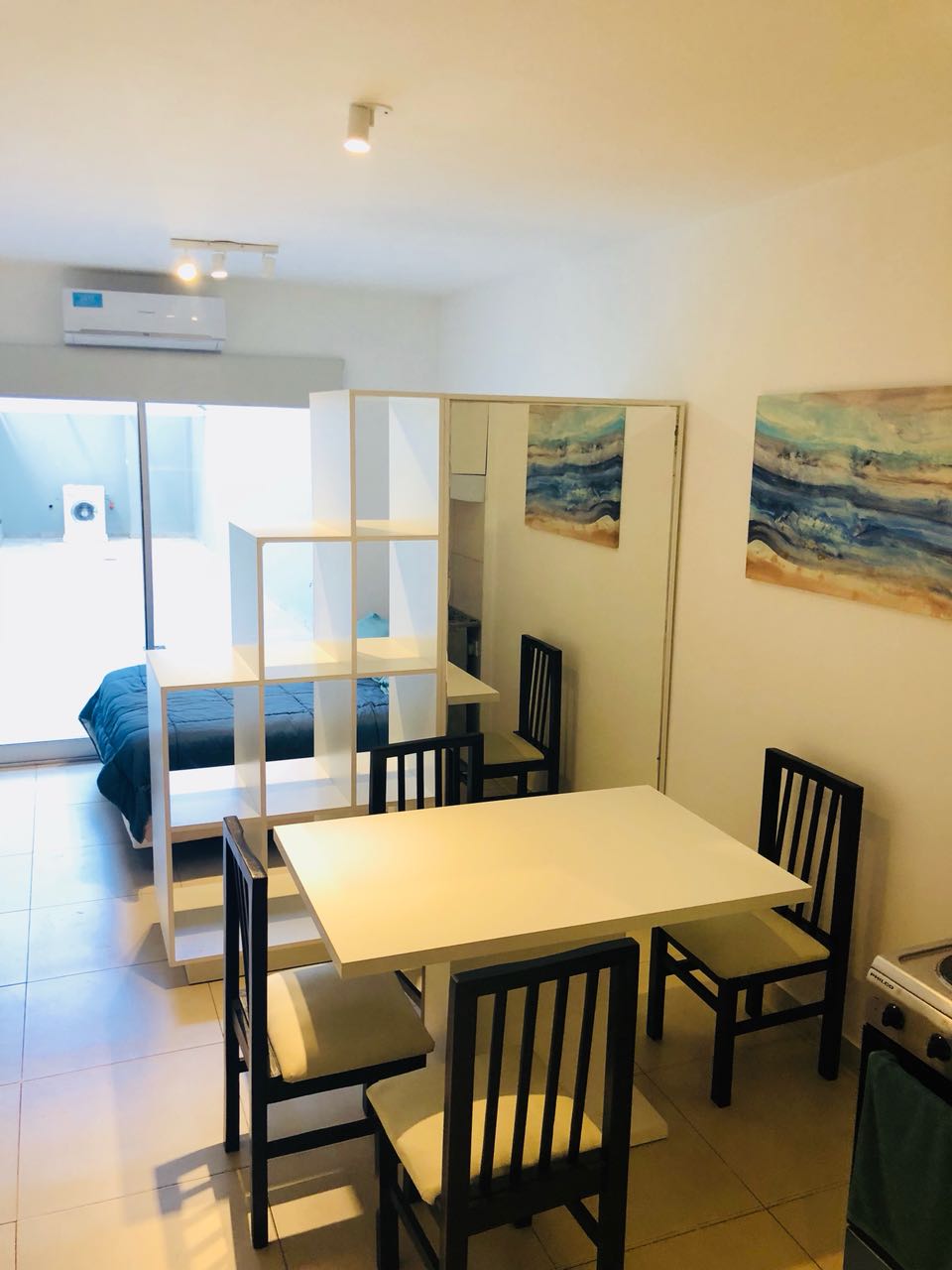 Impecable departamento con cocina integrada totalmente equipada, cama matrimonial con espacio de guardado y zapatero, patio y baño completo con bañera.