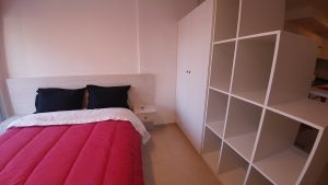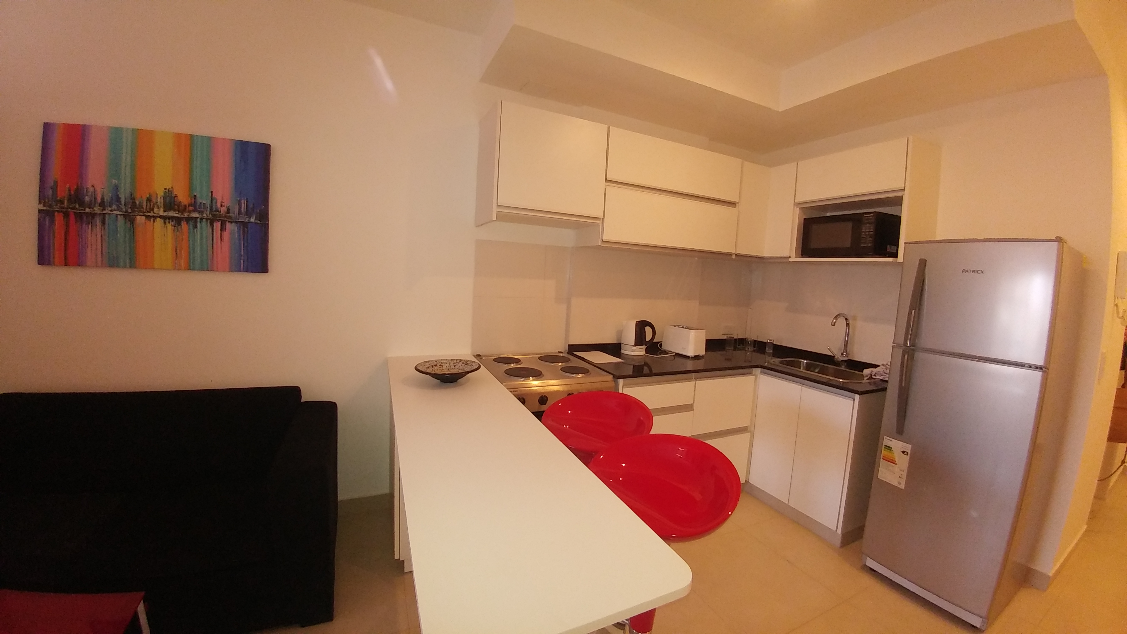 Impecable departamento con cocina integrada totalmente equipada, cama matrimonial con espacio de guardado y zapatero y baño completo con bañera.