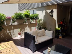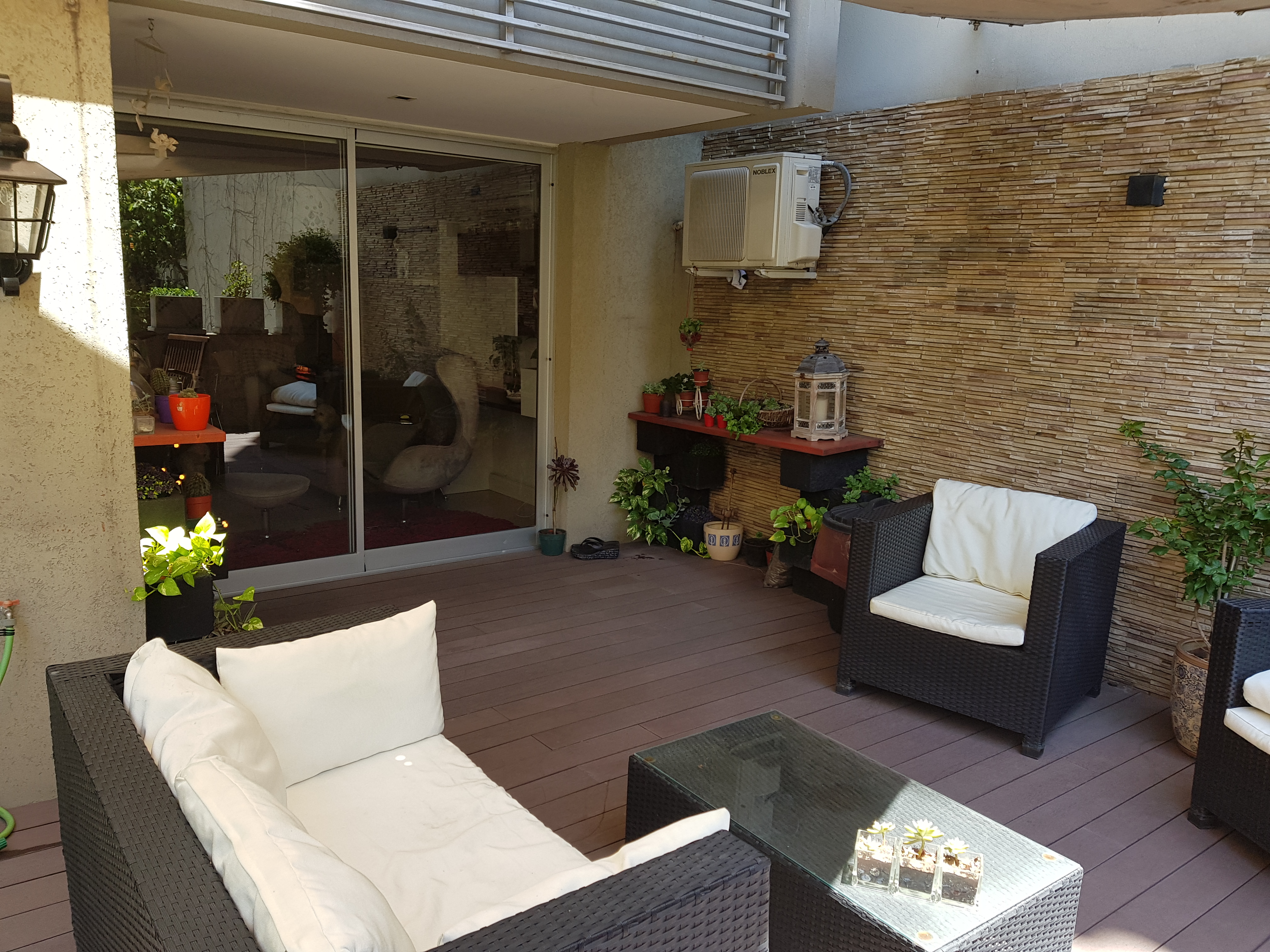 Pisos de porcelanatto en ambiente y baño y de madera en balcón terraza y patio.